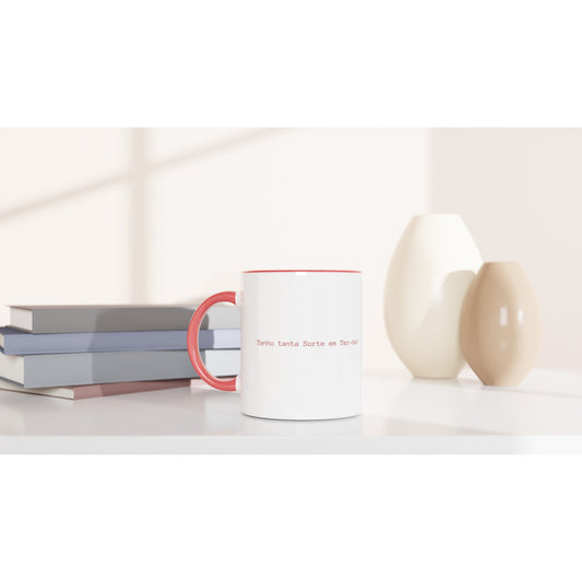 Caneca com motivo: Tenho tanta Sorte em Ter-te! + A Sorte é toda Minha! (branca com interior rosa)