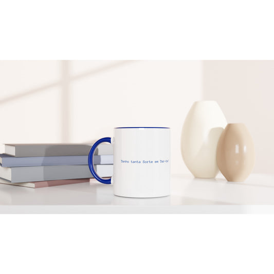 Caneca com motivo: Tenho tanta Sorte em Ter-te! + A Sorte é toda Minha! (branca com interior azul)